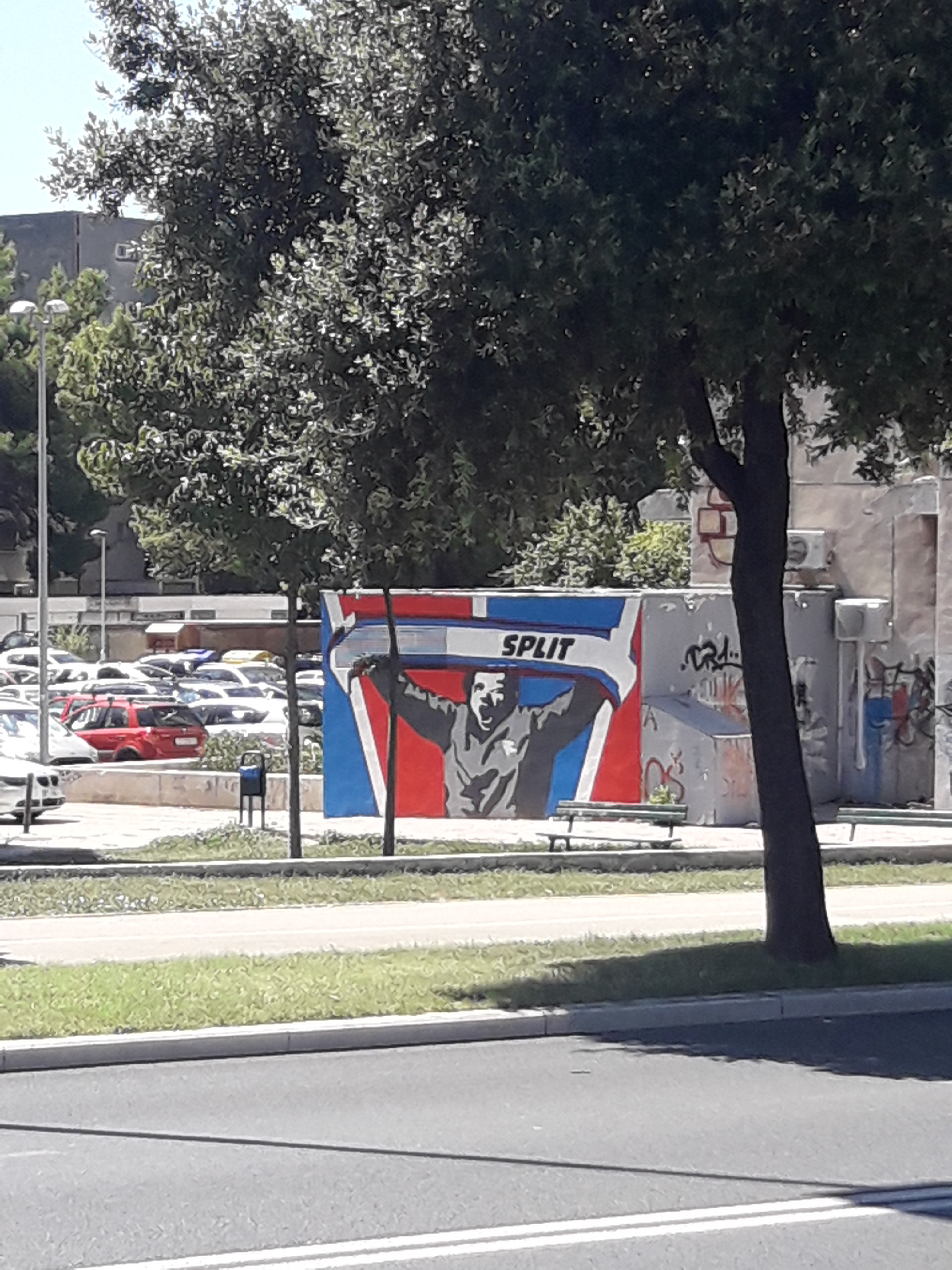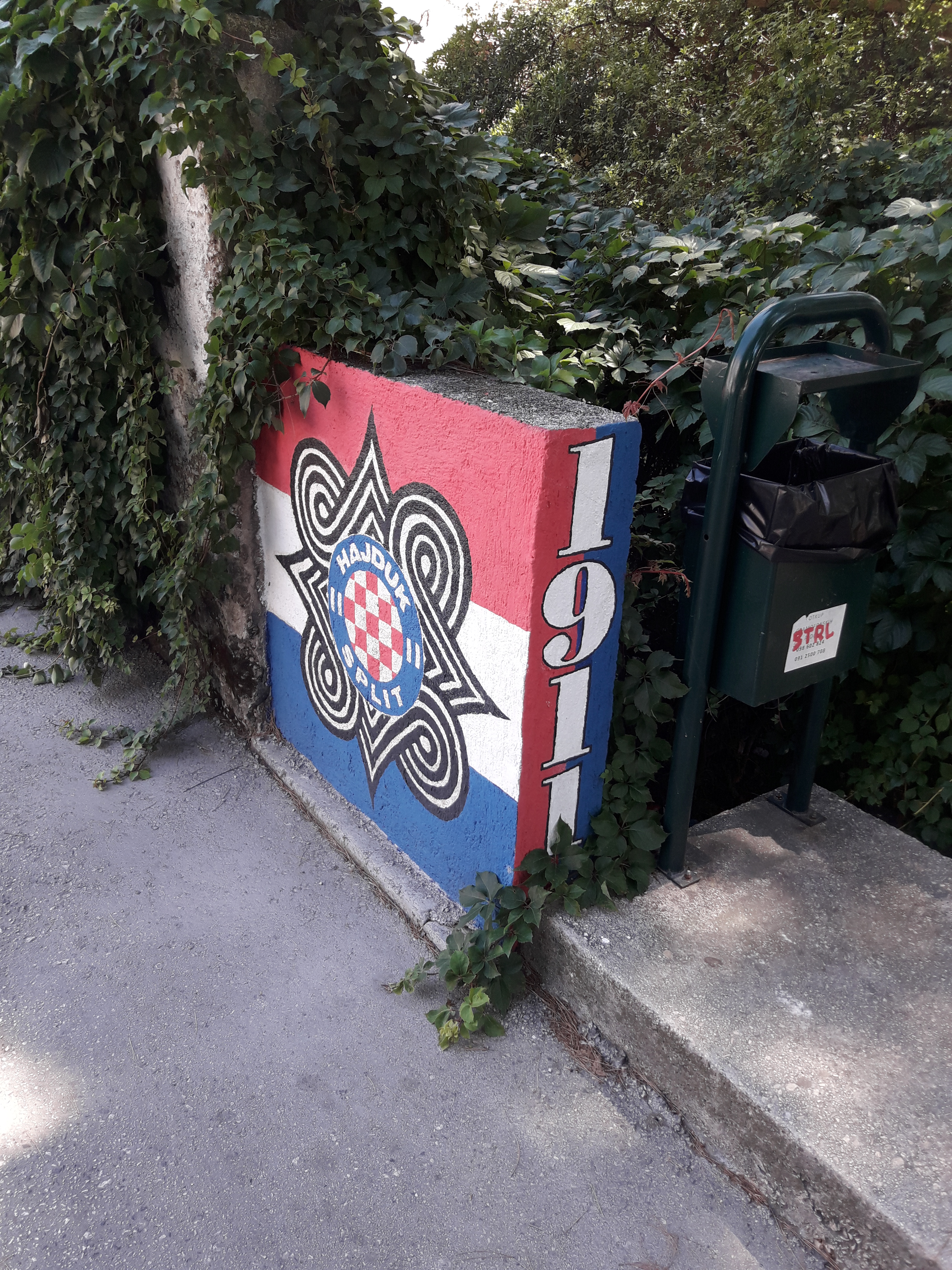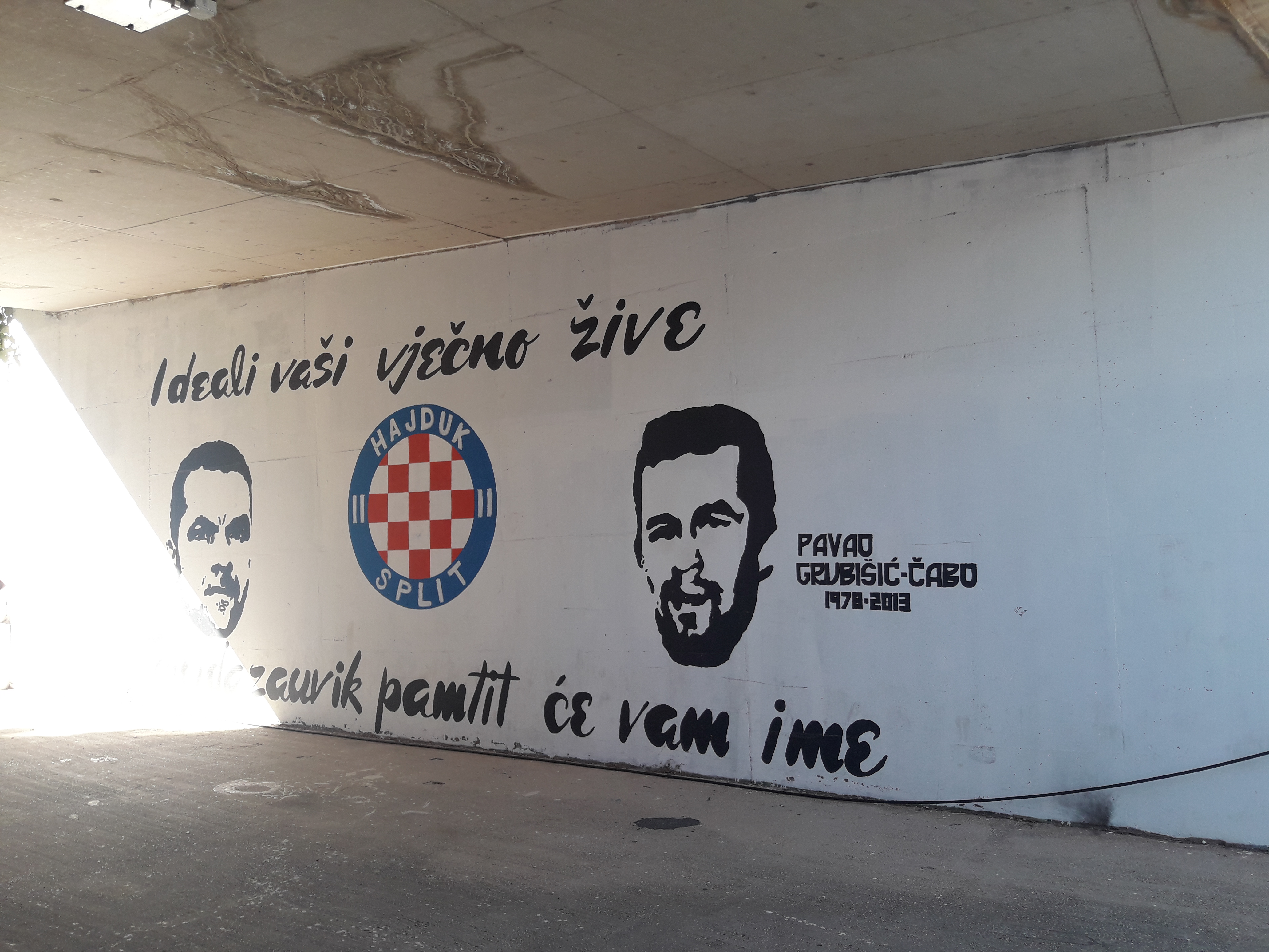 В плане граффити в Сплите посмотреть однозначно есть на что! Город, пригороды, окрестности и соседние города просто утопают в разных рисунках. Тут и небольшие трафареты, и длинные куски вдоль дорог, и простенькие эмблемы клуба на гаражах и сложно выполненные портреты игроков и фанатов, на трассе от аэропорта и в самом историческом центре. Радует, что откровенных каляк нету, все работы выполнены аккуратно и чётко.